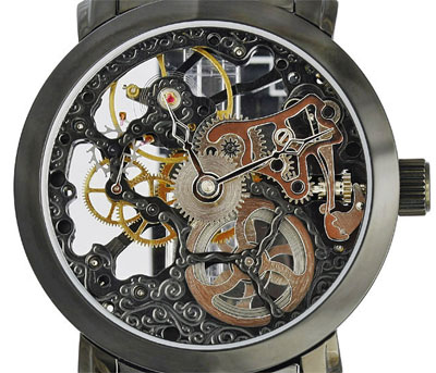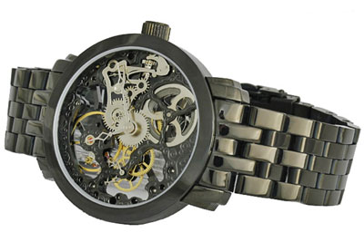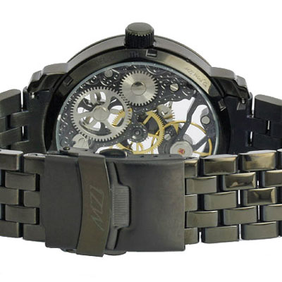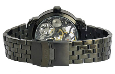 Szerkezet mechanikus precíziós kézifelhúzós óramű gazdagon díszített nemeascél skeleton szerkezet 25 köves másodpercmutató 9 óránál Számlap átlátszó "Skeleton" design többféle számlappal kapható Tok átlátszó tok, és hátlap fekete (PVD) ionizált nemesacél tok átmérő: 43mm (korona nélkül) vastagság: 11mm vízállóság: 5 ATM keményített minerálüveg biztonsági korona - koronazár átlátszó - üvegezett - hátlap Szíj fekete (PVD) ionizált nemesacél csat szíj hossz: 23cm Súly 156g