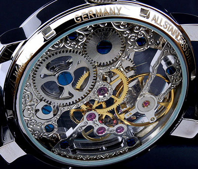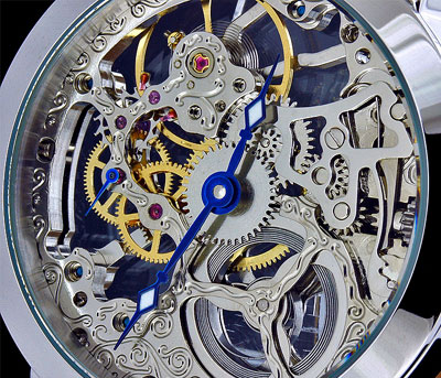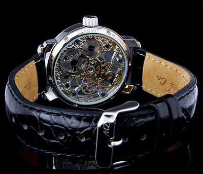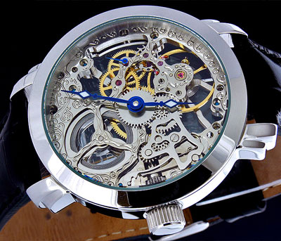 Szerkezet mechanikus precíziós kézifelhúzós óramű gazdagon díszített nemeascél skeleton szerkezet 25 köves másodpercmutató 9 óránál Számlap átlátszó "Skeleton" design kék színű óra, perc, és másodpercmutató többféle számlappal kapható Tok átlátszó tok, és hátlap tömör nemesacél tok átmérő: 43mm (korona nélkül) vastagság: 11mm vízállóság: 5 ATM keményített minerálüveg biztonsági korona - koronazár átlátszó - üvegezett - hátlap Szíj Eredeti - krokodil design - bőrszíj tömör nemesacél csatvég, MZI lézergravírozással szíj hossz: 23cm Súly 68g