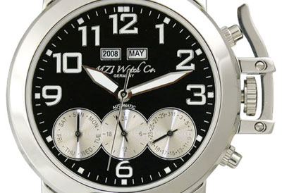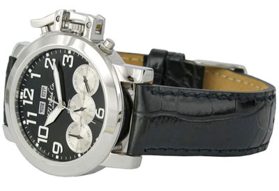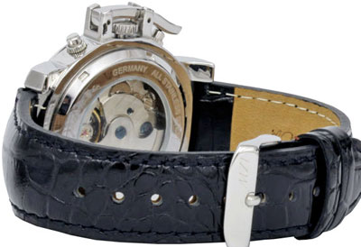 Szerkezet mechanikus precíziós automata óramű 20 köves MZI lézergravírozott rotor év kijelző 12 óránál hónap kijelzés 12 óránál nap kijelzés segédszámlapon dátumkijelzés segédszámlapon 24 órás kijelzés 24 órás kijelző segédszámlapon központi másodpercmutató Számlap világító jelzések, mutatók fekete számlap ezüst színű segédszámlapok többféle számlappal kapható Tok speciális koronavédő kar tömör nemesacél tok átmérő: 42mm (korona nélkül) vastagság: 13mm vízállóság: 5 ATM keményített minerálüveg átlátszó - üvegezett - hátlap Szíj Eredeti - krokodil design - bőrszíj tömör nemesacél csatvég, MZI lézergravírozással szíj hossz: 23cm Súly 90g
